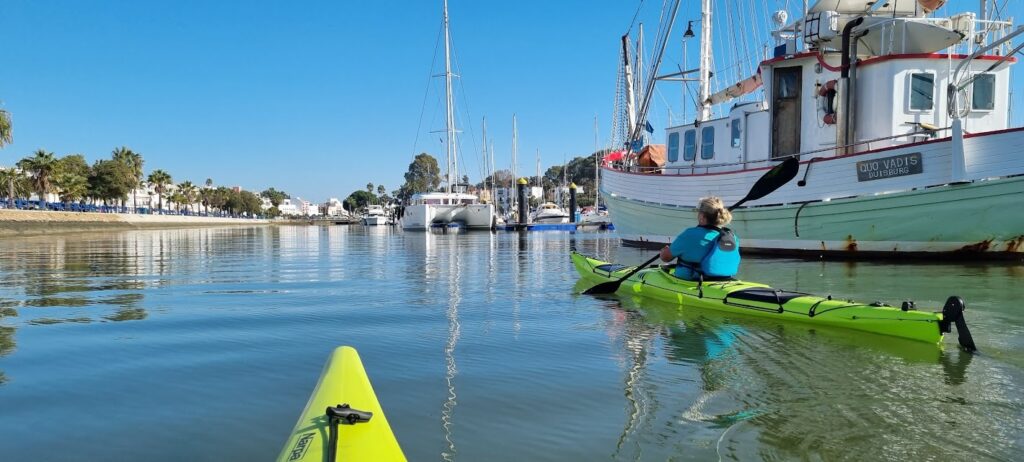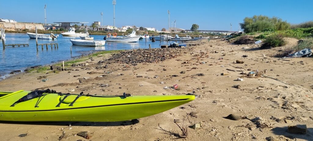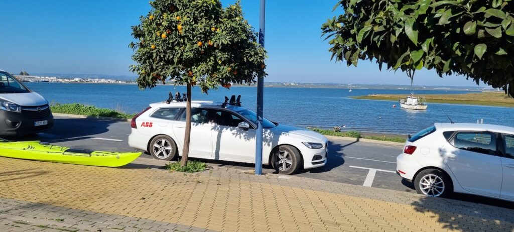 Säger det ofta men nu måste jag skriva det också. Internet är fantastiskt. Vi bestämde oss för att paddla men visste inte riktigt vart. Med Google Maps i kartläge så kunde vi snabbt hitta en gata i Ayamonte som gick nära vattnet. Det är ca 25 min från campingen. Efter att ha växlat över till Satelitbild så såg det fortsatt lovande ut. En sista titt med Streetview avgjorde att det var värt att testa. Förberedelse ca 13 minuter.